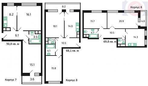 В корпусе №7 альтернативы маленькой двухкомнатной распашонке не существует. В корпусе №8 представлены распашонки и угловые двушки совсем другого уровня: