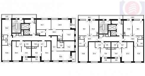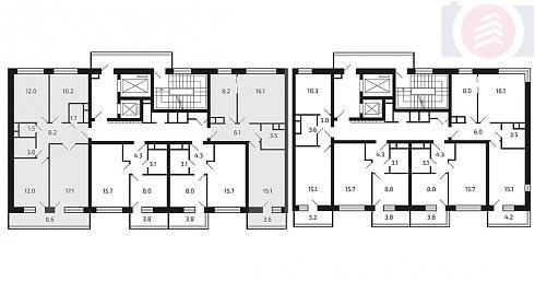 Внутреннее наполнение секций корпуса №7 различно, но квартир здесь тоже совсем немного – по 4 на этаже в обеих секциях: