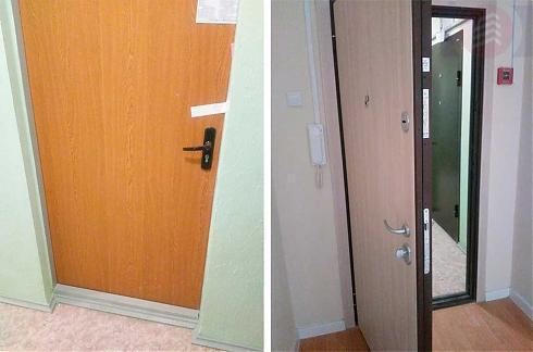 В квартирах без отделки устанавливается простенькая деревянная дверь «под замену», во всех прочих вариантах дверь будет металлической: