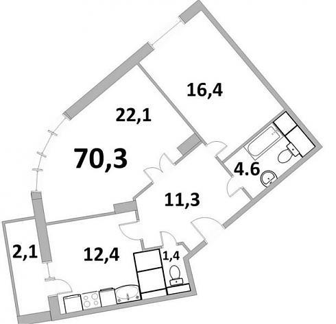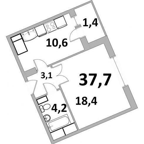 В большинстве своем, в Комплексе представлены одно- и двухкомнатные квартиры, трехкомнатных здесь не более 15% от их общего числа. Выбор площади квартиры и вариантов ее планировки в Комплексе по настоящему велик, при этом Застройщик на эту самую площадь явно не поскупился – студийные каморки здесь отсутствуют, а отношение к квадратным метрам проявлено трепетное. В самой маленькой однокомнатной квартире общей площадью 37,7 квадратов жилой комнате и кухне досталось больше всего метров: