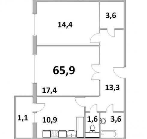 Среди двухкомнатных квартир Вы найдете и линейные варианты планировки, как в этой 65,9 метровой двушке: