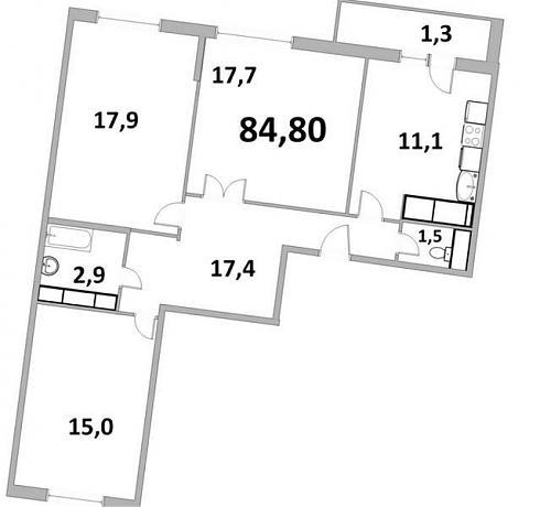Трехкомнатные распашонки бывают совершенно непохожими – Вы можете убедиться в этом, сравнив планировки этой 84-метровой квартиры: