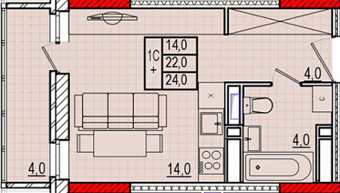 Маленькие 24-метровые студии отличает наличие полноценного санузла, возможность встроить шкаф в прихожей и обилие света в 14-метровой кухне-спальне: