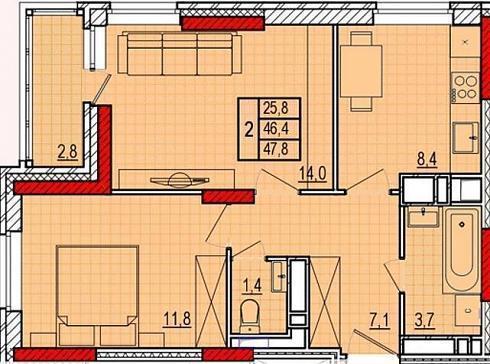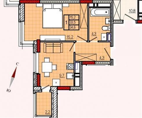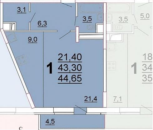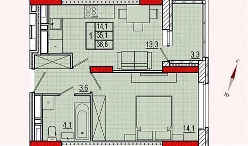 Планировка однокомнатных квартир в этих корпусах подразумевает равномерное распределение квадратных метров между жилой и нежилой зонами.