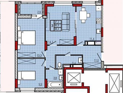 Несмотря на то что площадь трехкомнатных квартир в данных корпусах откровенно мала, их планировки заслуживают отдельного упоминания, как например в этой «трешке», где на 66,9 кв. м общей площади проектировщики разместили большую кухню и нашли место для двух санузлов: