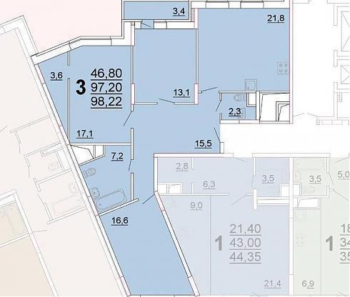Ну и площади квартир здесь тоже совсем другие, нежели мы видели в одно- и двухсекционных корпусах. Любопытно, что в проектной декларации на 52 дом не упоминаются студии, хотя, несмотря на внушительные метражи, они тут все же есть, в варианте поменьше: