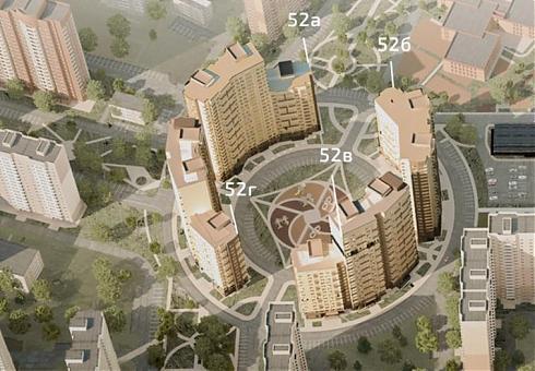 Переходим ко второй группе, к которой отнесем стоящие кружком трех секционные 14-23-этажные корпуса 52а, 52б, 52в и 52г.