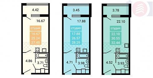 Планировки студий разнообразными назвать не получится, но то, что они сделаны пригодными для нормальной жизни, сомнению не подлежит, чему в подтверждение будут их площади, наличие больших лоджий и полноценного санузла: