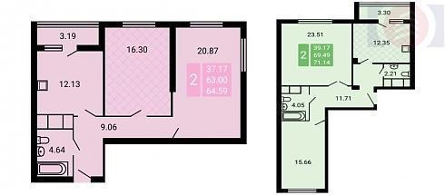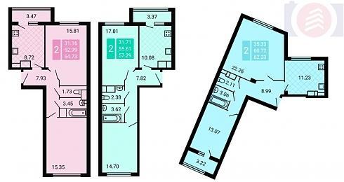 Для двухкомнатных квартир комплекса за основу была принята распашная планировка с площадью в районе 55 кв. м. В качестве дополнения здесь представлены распашонки с чуть большим метражом и угловые варианты в корпусе №12: