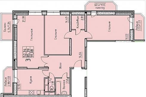 Трехкомнатные квартиры обладают площадью под 90 кв. м, в некоторых из них есть пара лоджий и балкон: