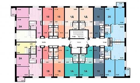 Корпус 1: 17 этажей, 214 квартир, 2 коммерческих помещения, 70 кладовых площадью от 1,83 до 7,74 кв. м.