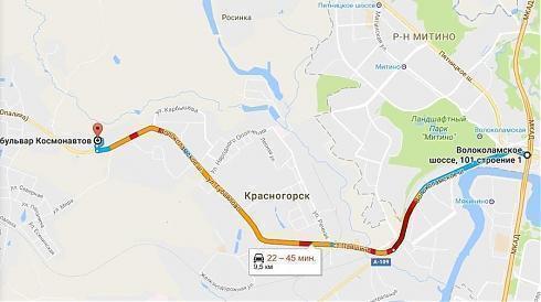 Если же появится необходимость в будний день добраться на автомобиле до пересечения Волоколамского шоссе с МКАД, то на это может потребоваться от получаса до 45 минут езды.