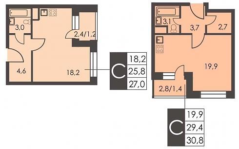 | Июль 2018 | 27-30,8 м2 | 2 640 500 - 3 370 640 ₽ | ~105 459 ₽ | |