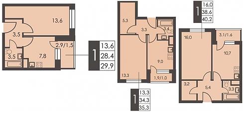 Выбор однокомнатных квартир простирается в диапазоне экономных 29,9 и действительно комфортных 40,2 кв. м.