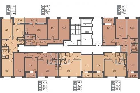 Секция №3 имеет переменную этажность: на этажах со 2 по 13 расположено 9 квартир: