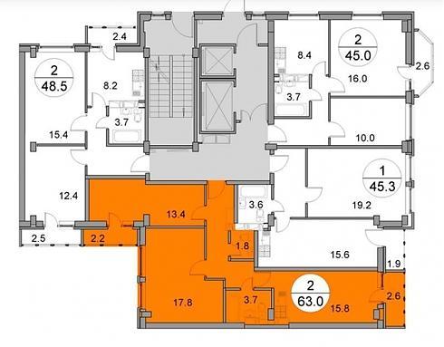 и тем, кому приглянется 63-метровая двушка, повезет больше – на таких этажах квартир всего-то по четыре.