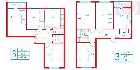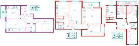 И в линейных, и в распашных трехкомнатных квартирах лоджия с одним входом-выходом протягивается на две комнаты: