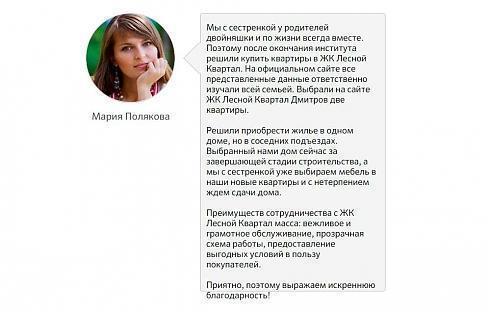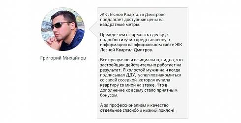 Право использовать словосочетание официальный сайт ЖК «Лесной квартал» получили три брокера проекта. Информация на них подается по-разному, но больше всего отличилось Агентство недвижимости Город, с целью внедрения в мозг потенциальных покупателей, разместившее на своем сайте кучу пугающе правдоподобных отзывов. Тут люди и за наличку квартиры покупают,