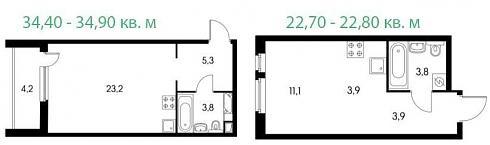 Студии. По понятной причине на «шахматке» корпуса 1.1 им присвоен индекс «1», каким по общему правилу обозначают однокомнатные квартиры – площадь 34,4 кв. м больше свойственна «однушкам». Интересная деталь – именно эти студии обладают лоджиями, которых нет в подавляющем большинстве квартир в описываемых корпусах. Варианты в домах 7.1 и 7.2 выглядят так, как и должны выглядеть в исполнении ПИКа: