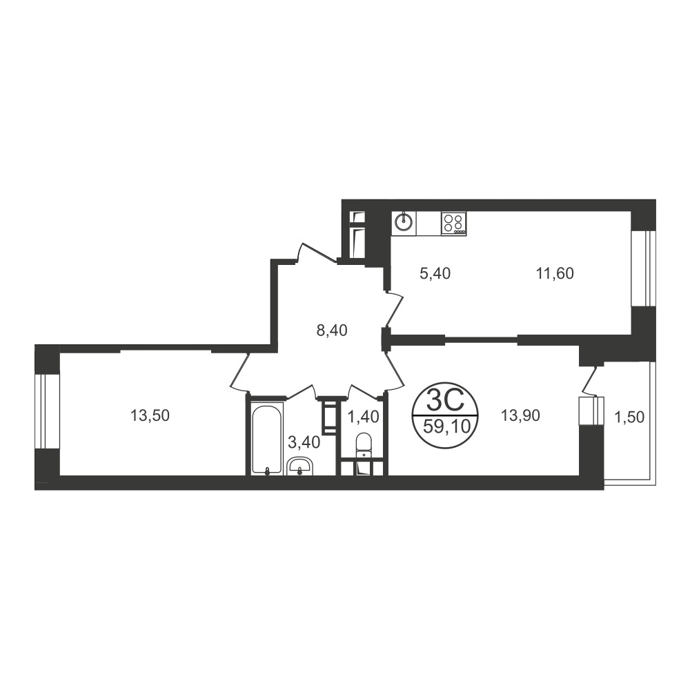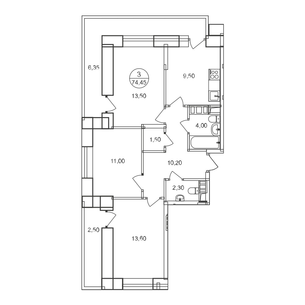 «Евро-трешкам» положена исключительна распашная планировка, мизерная разница в площади 59-61-метровых квартир обусловлена количеством лоджий. В 70-метровых трехкомнатных студиях доминирует 21-метровая кухня-гостиная: