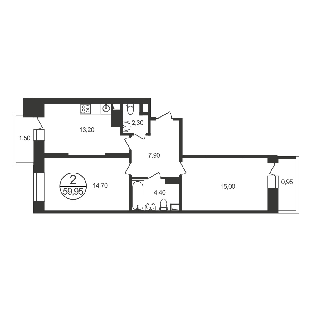 Угловое расположение «евро-двушек» гарантирует обилие света в кухне-гостиной, в линейных вариантах имеются один-два балкона: