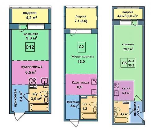 25,7 кв. м – 4-метровая лоджия делает такую квартиру визуально больше. 33 кв. м – лоджия здесь уже 7-метровая, прибавка затронула санузел, коридор и жилую комнату. 38,2 кв. м – такая площадь превышает стандарты однокомнатных квартир в домах панельных серий, но пенал остается пеналом в любом случае, назвать такое жилище светлым не получится: