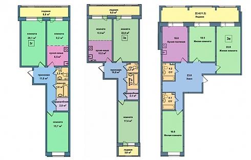 Трехкомнатных квартир здесь не слишком много, и все они имеют, по сути, одно и то же распашное планировочное решение. Площади до 100 метров включительно достаются «евро-вариантам», 119-метровые трешки будут иметь три изолированные комнаты: