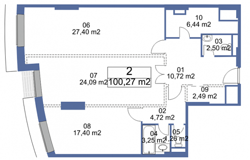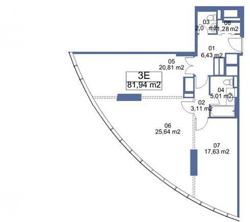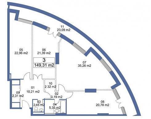 Самое «вкусное» и эксклюзивное по части планировочных решений Вы найдете в 15 секции (корпус 5) – благодаря ее форме внешние стены лишены прямых линий, а с 38 по 40 этаж здесь появляется панорамное остекление, как в этой трехкомнатной евро-квартире: