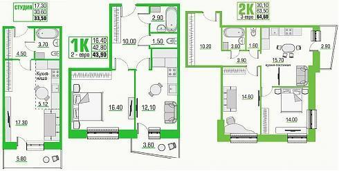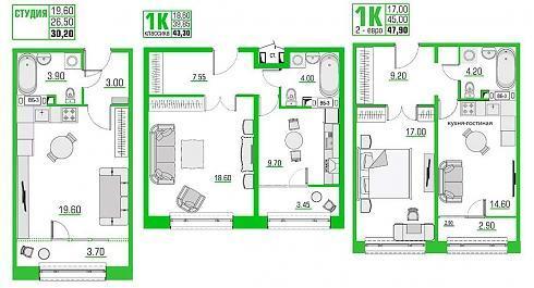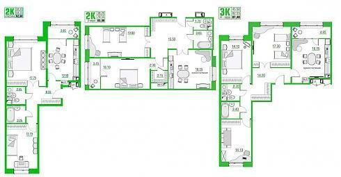 В двухкомнатных и трехкомнатных квартирах присутствуют гостевые санузлы, покупателю доступны распашные и линейные планировки «двушек», а также одна единственная планировка «трешки»: