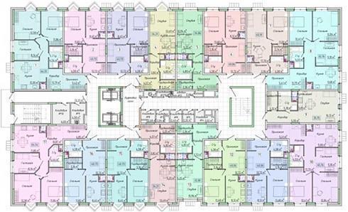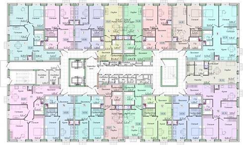 Поэтажные планы выглядят несколько необычно. Заглянув внутрь, Вы будете удивлены: первое впечатление, что корпуса ЖК являются двухсекционными, окажется обманчивым. На самом деле вход в подъезд со двора тут один и находится он посередине дома. На лестничной клетке, объединяющей весь жилой этаж, располагаются 17 квартир, причем лифтов отечественного производства здесь будет всего два, и находятся они вовсе не в центре, а смещены влево (в правой части есть только лестница). Между лестницей и лифтами расположены те самые кладовые помещения (еще две кладовки находятся рядом с выходом на технический балкон, через который можно пройти к пожарной лестнице). В зависимости от этажа расположения, квартиры могут иметь обычные окна