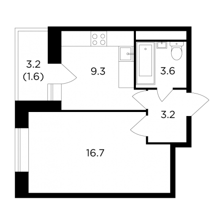 1-комнатная квартира  34.4 м2