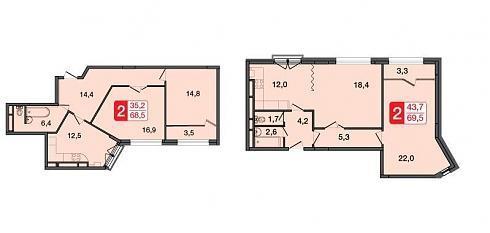 Двухкомнатные. Здесь, при наличии очень достойного метража, выбор планировок оказывается весьма широким. Стандартные линейные и распашные варианты: