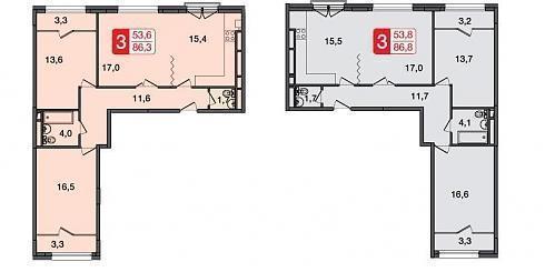 Трехкомнатные. Их не слишком-то и много, по сути, всего два зеркальных варианта, отличающиеся копеечной разницей в метраже. При желании здесь можно объединить кухню с гостиной: