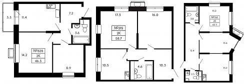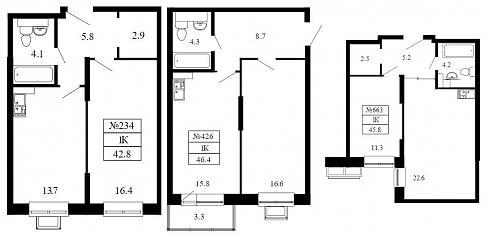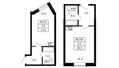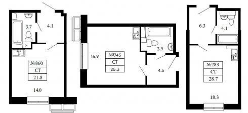 Почти 40% квартирного фонда комплекса занимают студии, отличающиеся не только своими размерами, но и конфигурацией. Вытянутостью форм страдают далеко не все такие квартиры, при этом проблем с наличием крошечных санузлов не наблюдается ни в одном из представленных вариантов: