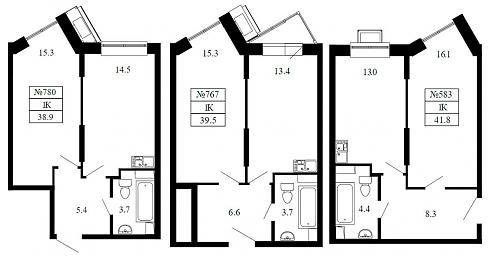 Однокомнатные квартиры с одним или двумя треугольными эркерами сосредоточены в секции №3.