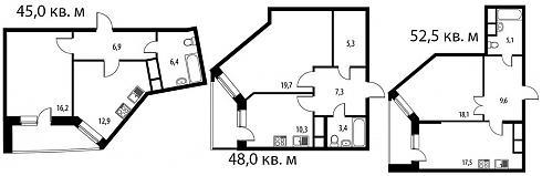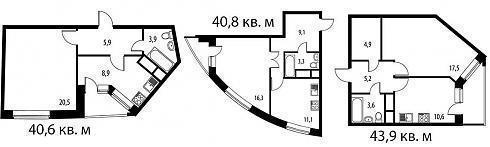 Представленные планировки, в большинстве своем, позволяют разгуляться фантазии – в данном корпусе квартиры с обычными, прямоугольно-квадратными формами находятся в явном меньшинстве по сравнению с квартирами, обладающими не вполне привычными планировками с трапециевидными комнатами или комнатами с закругленными стенами. В общем, пристальное разглядывание всех этих шедевров представляется весьма увлекательным занятием. Чего не отнять, так это метражей, диапазон которых в однокомнатных квартирах находится в пределах 40-53 кв.м: