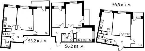 Планировки двухкомнатных квартир выглядят гораздо менее эксцентрично, хотя кое-какие странности можно усмотреть и здесь. Площади делятся на две категории – около 55 кв. м: