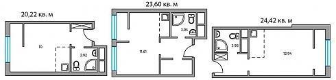 Студии, площадь которых укладывается в 20-24 метра, имеют серьезные различия не только по части метража, в таких квартирах может быть одно или два окна и место под небольшую гардеробную. Единственным, что их роднит, будет стабильно маленький санузел, в три квадрата которого уместится лишь душевая кабина: