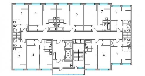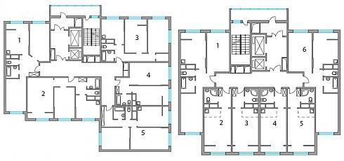 С количеством квартир на лестничных клетках дела обстоят по-разному, а вот количество лифтов для всех секций одинаково – Карачаровский механический завод ставит в подъезд один пассажирский (400 кг) и один грузопассажирский лифт (1 000 кг). В тех секциях, где квартир на этаже будет пять или шесть