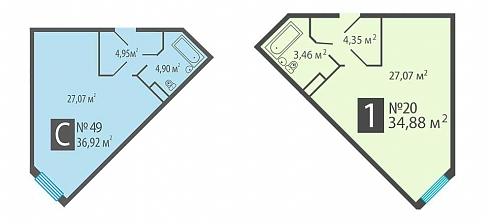 Итак, привычные студии имеют площадь от 23 до 37 кв. м, причем в ряде случаев, их планировки не выглядят обычными «пеналами»: