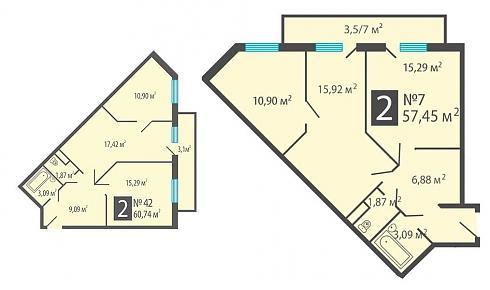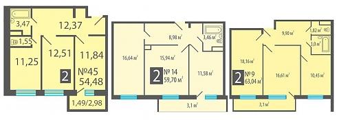 Площадь обычных двухкомнатных квартир ограничена 64 квадратами, хотя тут представлены и варианты поскромнее. Кухонь менее 10-11 кв. м Вы не встретите, балконы могут быть разной величины, санузлы бывают раздельные и совмещенные: