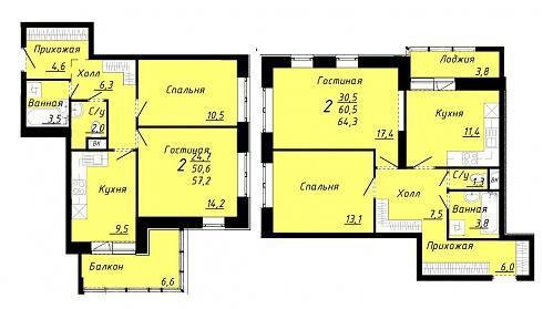 Двушки, имеющие, по сути, одно планировочное решение, ограничены 65 квадратами:
