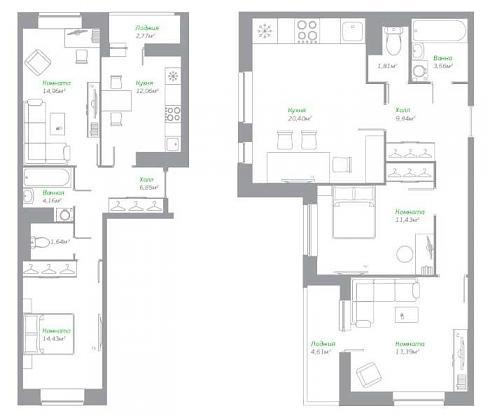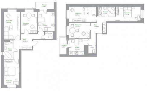 Двухкомнатные квартиры представлены в распашном и угловом исполнении, причем во втором случае их площадь будет превышать 60 кв. м: