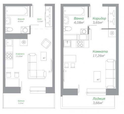 Планировка маленьких студий площадью 23,79 кв. м позволяет установить в санузле полноценную ванную, а площадь 26,82 кв. м дает возможность встроить в холле шкаф-гардеробную: