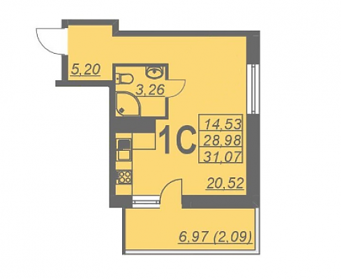 При беглом взгляде на список квартир, продающихся в доме 5-5А становится ясно, что иметь дело придется с квартирами эконом-класса. Как свидетельствует официальный сайт ЖК «Солнечный» в Жуковском, студии и однокомнатные квартиры занимают почти половину квартирного фонда Комплекса. Однако, при ближайшем рассмотрении выяснилось, что этот ЖК может и приятно удивлять. Начнем со студий. Самая маленькая формально имеет 28,5 кв. м общей площади, но за счет того, что метраж балкона высчитывается с учетом коэффициента 0,3, реальная площадь здесь на три метра больше: