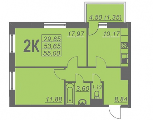 | Июнь 2018 | 53,78-55,34 м2 | 4 711 758 - 4 954 500 ₽ | ~89 502 ₽ | -2.83% |