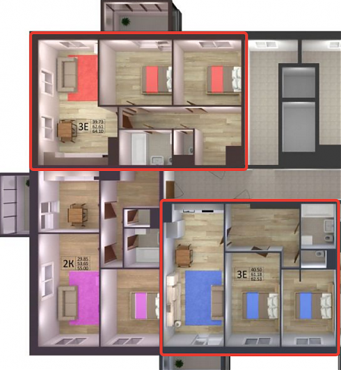 Трехкомнатные квартиры предлагаются исключительно в «евро» формате, по площади они, скорее, походят на «комфортные» двухкомнатные квартиры, к тому же, в Комплексе их крайне мало – 28, что сразу переводит их в категорию дефицитного товара.