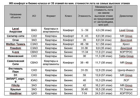 Из проектов бизнес-класса самое привлекательное предложение по стоимости можно найти в ЖК Freedom, который расположен в СЗАО: купить квартиру на 35 этаже можно за 9,9 млн рублей. Интересные бюджеты зафиксированы и в комплексе ILove, в котором стартовая стоимость квартиры на 31 этаже составляет 11 млн рублей. В пятерку также вошли ЖК «Фестиваль Парк» (минимальный бюджет лота на 35 этаже составляет 12,9 млн рублей) и ЖК D1 (в нем минимальный бюджет лота на 57 этаже составляет 13,9 млн рублей).