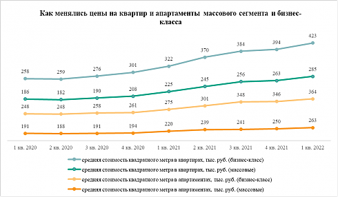 Аналитики «Метриум» отмечают, что квартиры бизнес-класса также дорожают быстрее, чем квартиры массового сегмента. Так, в I квартале 2022 года квартира в новостройке бизнес-класса стоила в среднем 423 тыс. рублей за кв. м, а в I квартале 2021 года – 322 тыс. рублей. Соответственно за год квартиры в новостройках бизнес-класса подорожали на 31%.