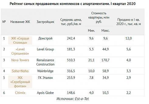 По данным Est-a-tet, в I квартале лучше всего шли продажи апартаментов в проектах «Сердце Столицы», «Level Стрешнево», Neva Towers, Soho+Noho и ЖК «Серебряный фонтан». Средние цены в этих проектах колеблются от 181 300 до 510 300 за кв. м. То есть успешные проекты есть во всех ценовых сегментах – главное адекватное сочетание цены и качества.